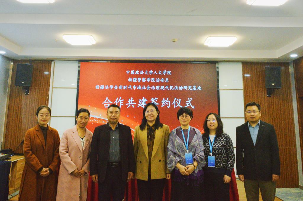 中国政法大学人文学院院长赵晓华教授、孔红教授、王威威教授、阴昭晖老师、教学办公室主任赵良伟老师,与新疆警察学院治安系主任高文骁教授、副主任胡蓉蓉副教授、靳敏老师共同出席了此次签约活动。