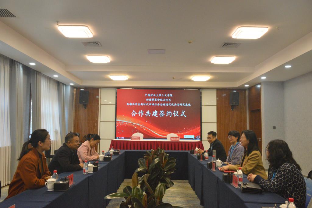 10月25日,中国政法大学人文学院与新疆警察学院治安系在乌鲁木齐举行座谈会,人文学院与新疆警察学院治安系、新疆法学会新时代市域社会治理现代化法治研究基地签署合作共建协议,签约单位将立足高校法治文化教育、边疆史研究与边疆法治理论与实践的坚实基础,致力于打造教学、科研、咨询一体化的实践基地,构建与边疆社会治理现代化进程相适应、同社会主义法治文化建设大格局相协调的合作体系。