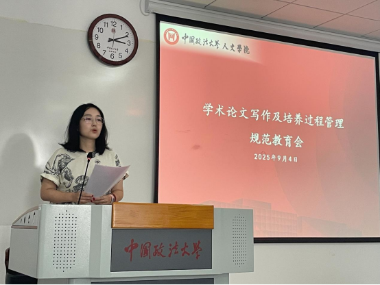 2025年9月4日,中国政法大学人文学院于学院路校区举办“学术论文写作及培养过程管理规范教育会”,为2025级研究生新生开展系统性入学指导。本次活动聚焦学术规范、过程管理与论文写作要求,旨在帮助新生厘清培养流程、树立学术诚信意识,为研究生阶段的学习与科研夯实基础。